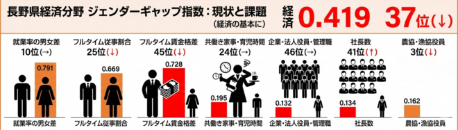 長野県は働く女性が多い一方で、意思決定の場に女性が少ない(全国46位)のが現状です。