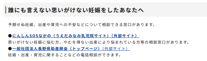 佐久市ではすぐに、「妊娠がわかったら」のページに、「誰にも言えない思いがけない妊娠をしたあなたへ」を追加してくれました。それまでは予期せぬ妊娠の相談窓口が分からない状態になっていました。